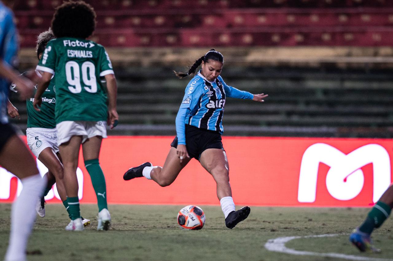 O Grêmio era melhor no primeiro tempo até os 25 minutos. Isso porque, em cobrança de falta, foi nesse minuto que o Palmeiras abriu o placar. Brena cobrou com categoria para fazer um golaço para as Palestrinas.