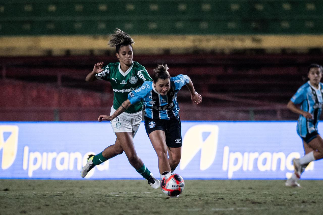 O Grêmio era melhor no primeiro tempo até os 25 minutos. Isso porque, em cobrança de falta, foi nesse minuto que o Palmeiras abriu o placar. Brena cobrou com categoria para fazer um golaço para as Palestrinas.