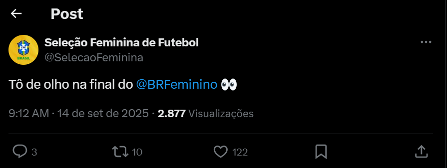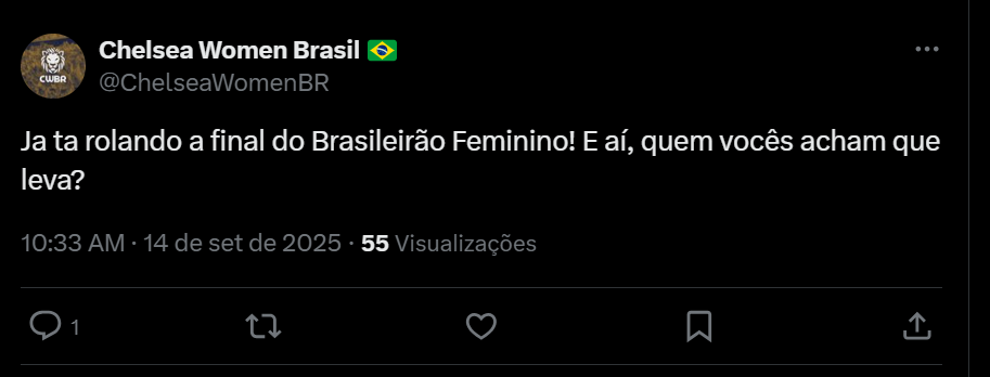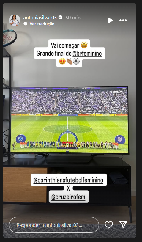 Nas redes sociais, alguns perfis ligados ao futebol feminino também manifestaram sua audiência em seus posts. O público que lota a Neo química Arena ganha companhia de outros milhares de torcedores que estão acompanhando essa grande decisão. De um lado o Corinthians, maior vencedor da competição, do outro um campeão inédito, com o Cruzeiro das Cabulosas.