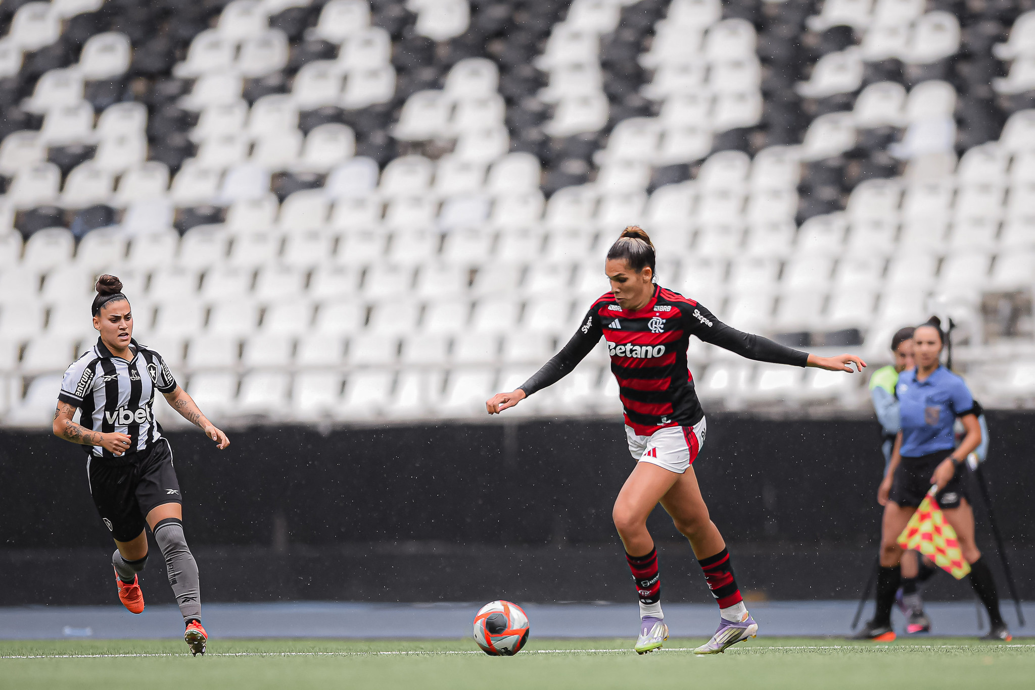 O primeiro clássico da equipe de Rosana Augusto começou como esperado, truncado e com poucas oportunidades. O Botafogo aproveitou melhor os espaços e criou perigo em contra-ataques, obrigando a goleira Karol Alves a fazer boas defesas. O Flamengo tentou responder em jogadas de bola parada e cruzamentos, mas não conseguiu finalizar com precisão. Nos acréscimos, Tipa aproveitou um rebote e abriu o placar para as Gloriosas, que foram para o intervalo em vantagem.
