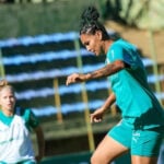 Kerolin assiste treino da Seleção Brasileira Feminina em Manchester; atleta está lesionada