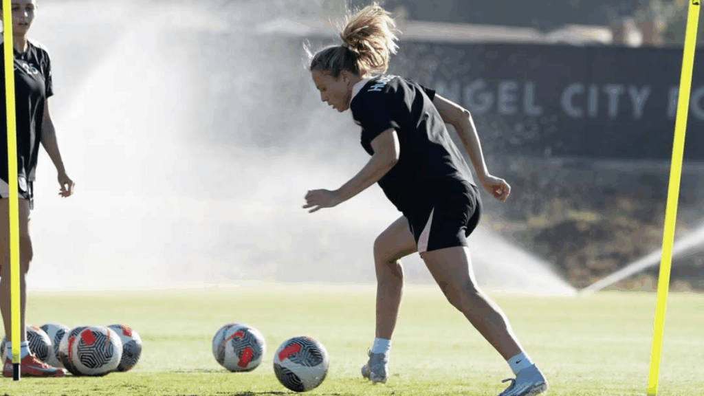 A escocesa Claire Emslie mostrou que a gravidez não está afetando o desempenho durante um treino do Angel City FC. A atleta, de 31 anos, está esperando o primeiro filho. Aos 8 meses de gestação, a atacante segue na ativa.
