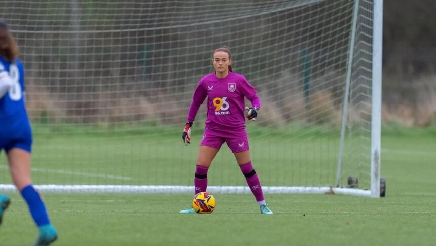 A cena é característica de uma boa goleira: defesa no canto, encaixando a bola, com ponte, mostrando elasticidade. E tudo poderia parecer cenas de um treino normal da goleira Naoisha McAloon, do Burnley, da Inglaterra, se as cenas não fossem em meio ao treino do time masculino.