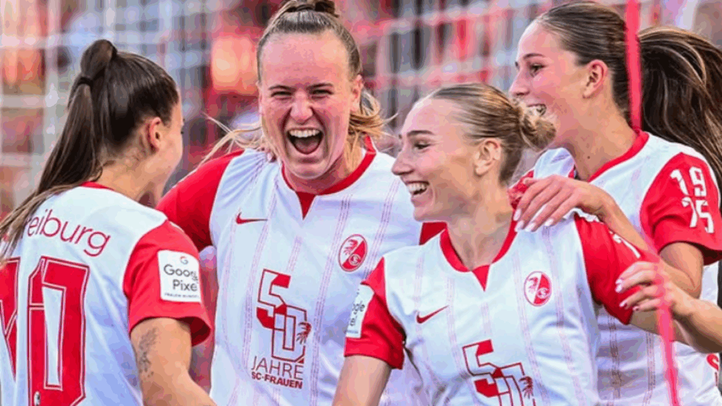 O uniforme traz a frase “50 Jahre SC Frauen”, em português significa “50 anos do SC Freiburg feminino”.