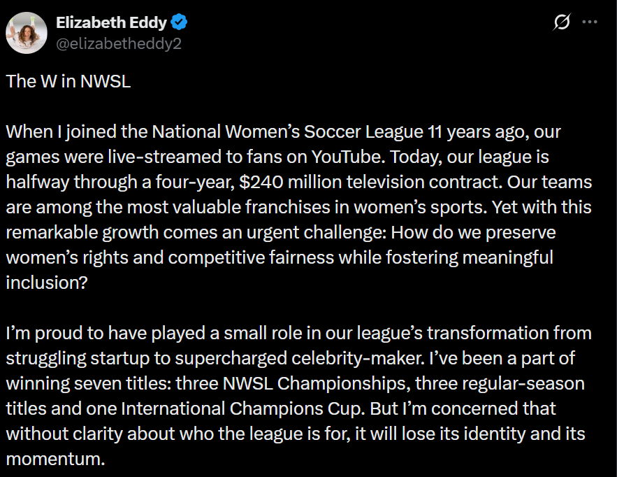 Esse é o trecho inicial do artigo de Elisabeth Eddy no New York Post: “Quando entrei para a Liga Nacional de Futebol Feminino (NWSL) há 11 anos, nossos jogos eram transmitidos ao vivo para os fãs no YouTube. Hoje, nossa liga está na metade de um contrato de televisão de quatro anos, avaliado em US$ 240 milhões. Nossos times estão entre as franquias mais valiosas do esporte feminino. No entanto, com esse crescimento notável, surge um desafio urgente: como preservar os direitos das mulheres e a competitividade justa, ao mesmo tempo que promovemos uma inclusão significativa?”