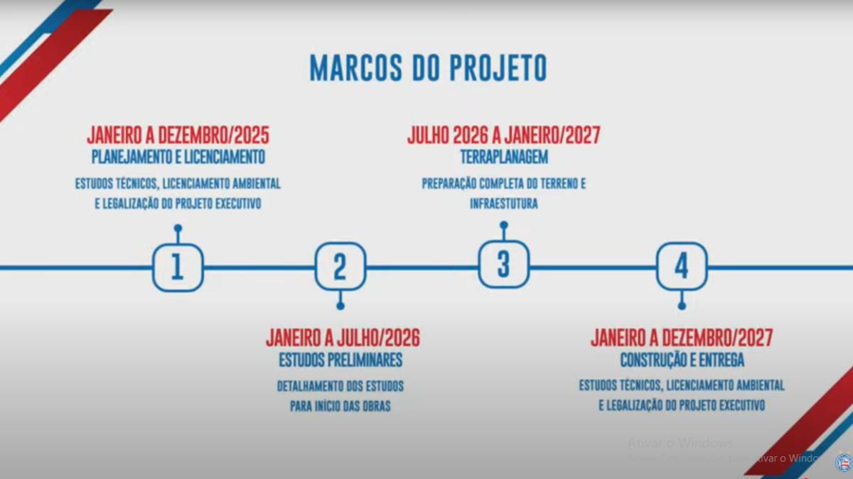 Raul Aguirre, CEO do Esporte Clube Bahia SAF, explicou os prazos para as etapas de preparação, planejamento e construção. A previsão é que as obras sejam concluídas em dezembro de 2027.