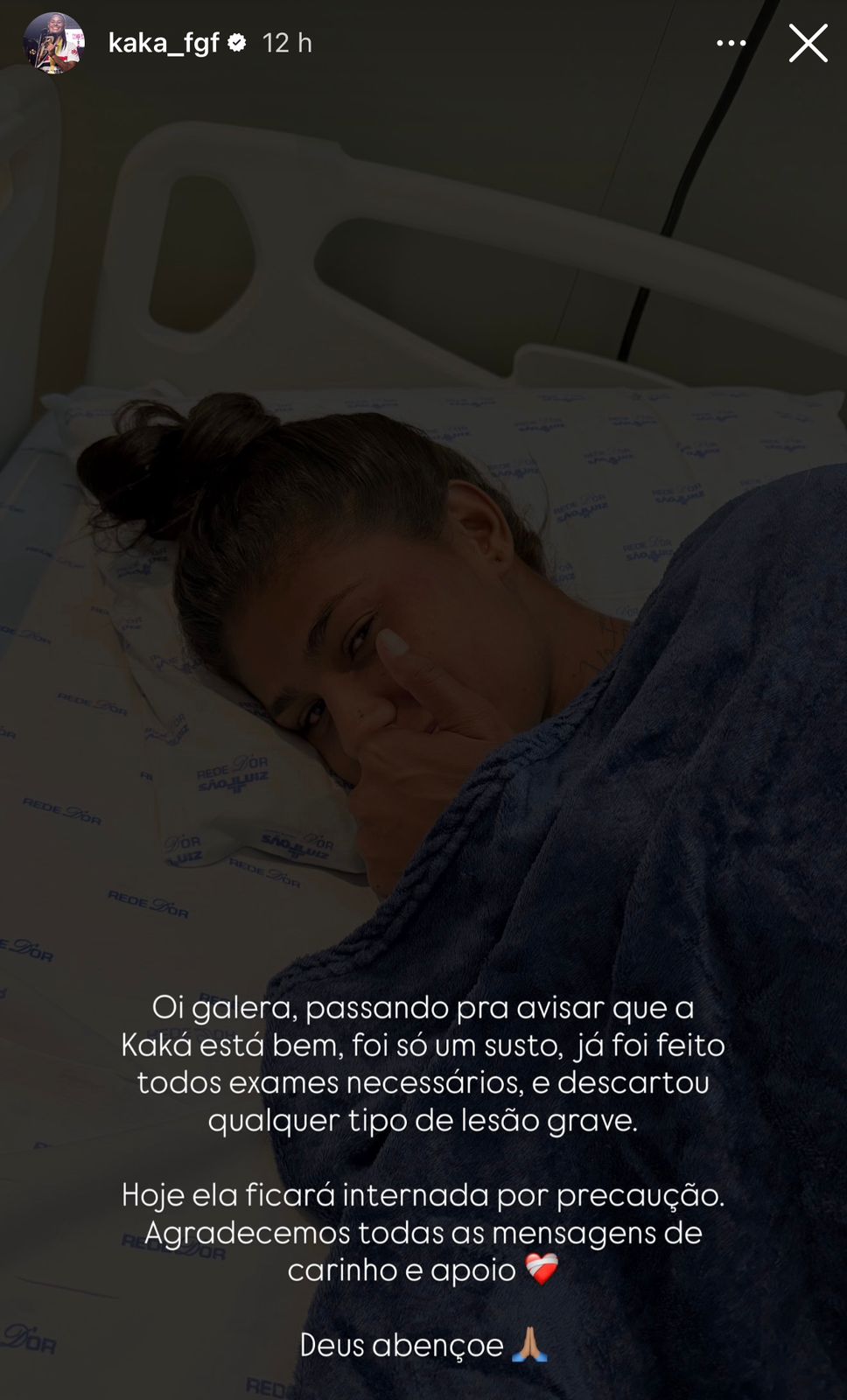 Nas redes sociais da atleta, ela tranquilizou a torcida com uma foto, seguido de uma mensagem.“Oi galera, passando para avisar que a Kaká está bem, foi só um susto. Já foi feito todos os exames necessários e descartou qualquer tipo de lesão grave. Hoje ela ficará internada por precaução. Agradecemos todas as mensagem de carinho e apoio. Deus abençoe.”