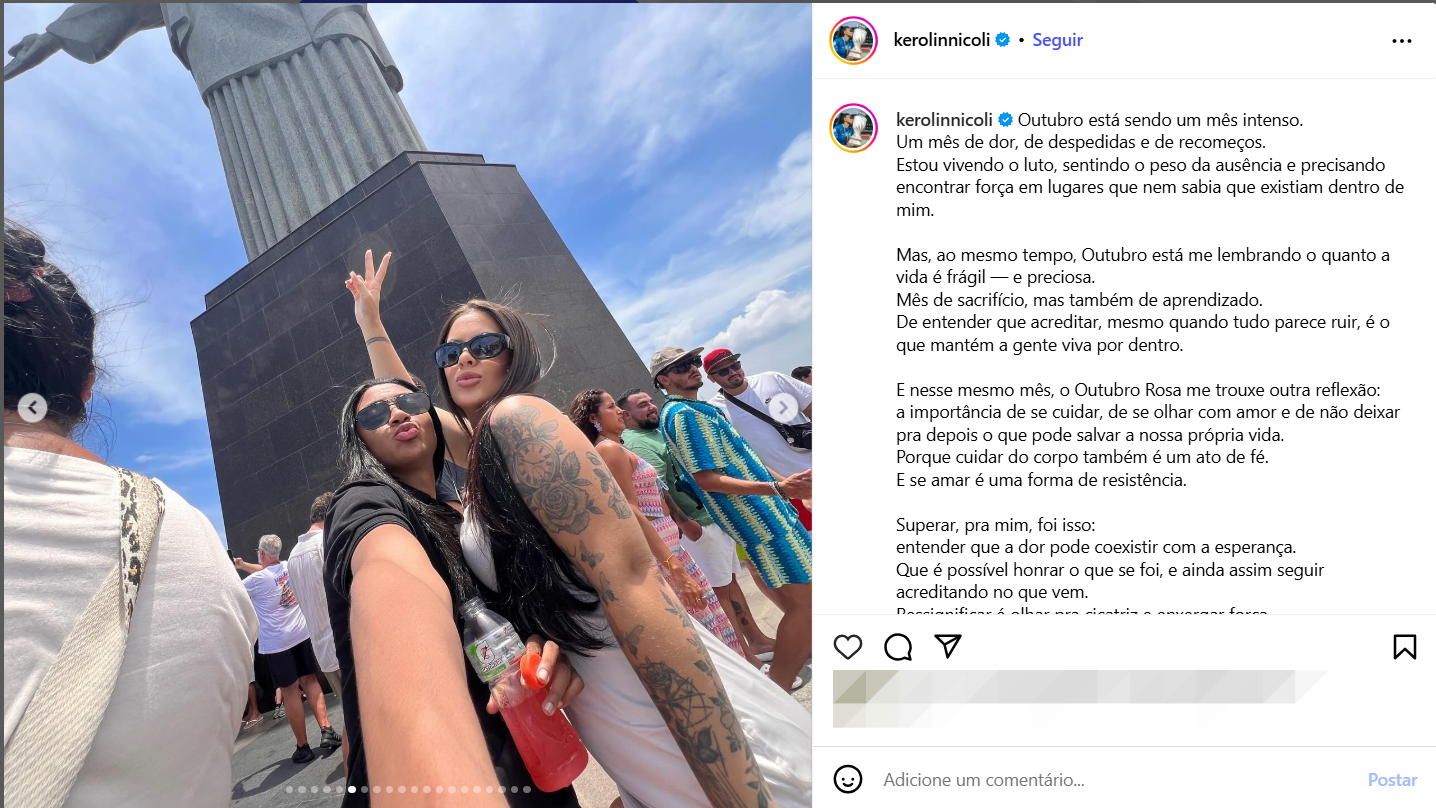 Em um forte texto, Kerolin cita a intensidade e a mistura de sentimentos vividas durante o mês: “Outubro está sendo um mês intenso. Um mês de dor, de despedidas e de recomeços. Estou vivendo o luto, sentindo o peso da ausência e precisando encontrar força em lugares que nem sabia que existiam dentro de mim”.