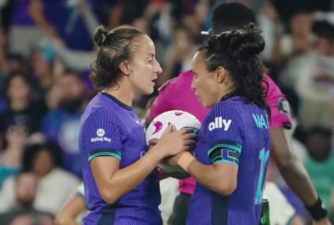 Luana recebe a bola de Marta para bater o pênalti e marcar o gol após vencer o câncer – reprodução Instagram @orlpride