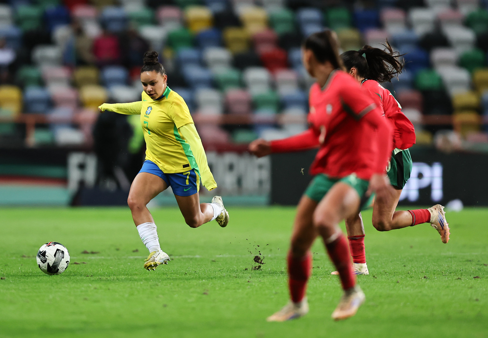 Aos 27 minutos, Isabella sobiu mais alto do que a marcação portuguesa e selou a goleada da Seleção Brasileira Feminina.