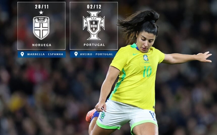A Seleção Brasileira Feminina enfrenta a Noruega, no dia 28 de novembro, às 15h, pelo horário de Brasília, no Estádio Municipal de La Linea, em Marbella, Espanha. Já no dia 02 de dezembro, a equipe comandada por Arthur Elias encara a Seleção Portuguesa, no Estádio Municipal de Aveiro, em Portugal, às 16h45.