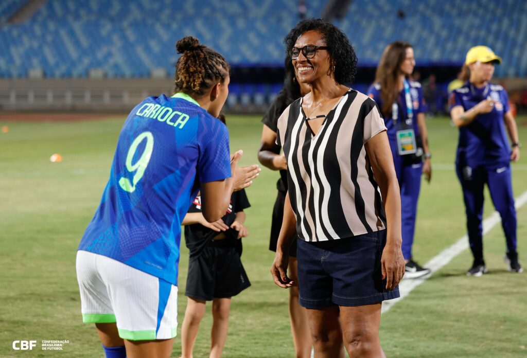 As jovens atletas da Seleção Brasileira Sub-20 receberam uma visita muito importante no jogo contra o México, em Goiânia. Trata-se de uma das pioneiras do Futebol Feminino brasileiro, a ex-atacante Michael Jackson, uma das maiores referências da modalidade no país. A presença da ex-jogadora deixou a vitória da equipe por 1 a 0 ainda mais especial.
