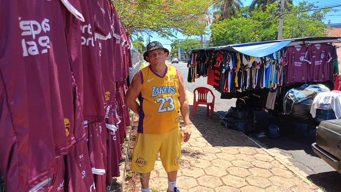 É o caso de Maurício Barbosa da Silva, 51 anos, ambulante já há duas décadas. Assim, ele sempre busca um ponto estratégico em dias de jogos da Ferroviária para oferecer suas camisetas e bandeiras para os torcedores: